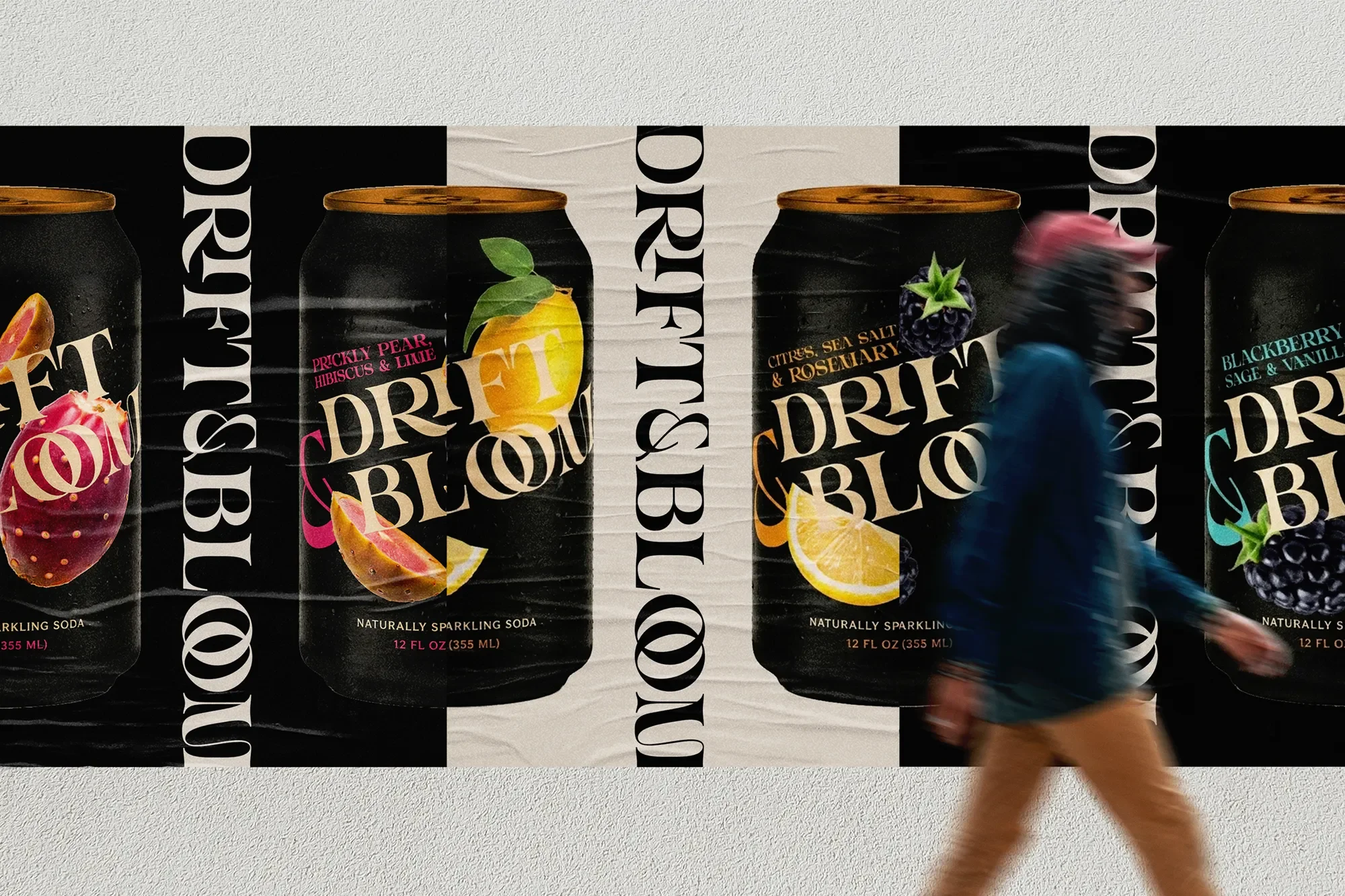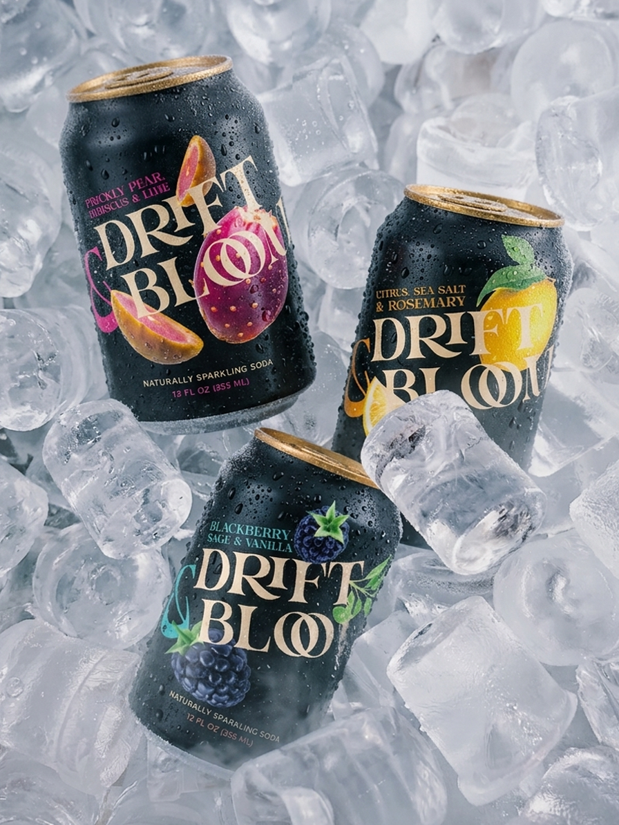 Drift & Bloom is a concept for an all-natural sparkling soda brand, infusing emotions and memories into every sip with bold flavour combinations.