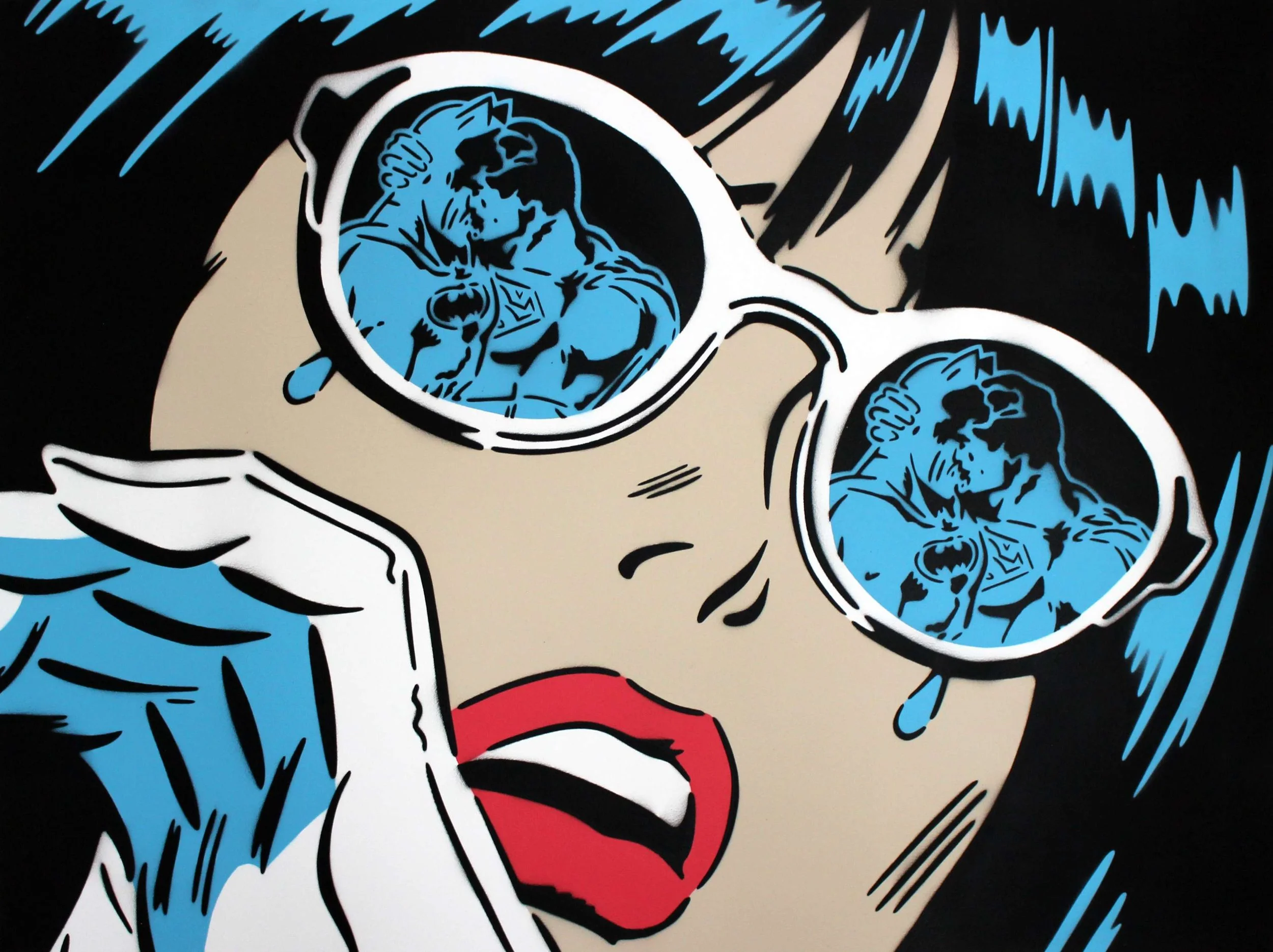 I fell in love with comic books and street art at a similar time. These very bold, graphic styles merged in my mind – that fusion can be seen so much in pop art. The bold colours, the thick line work, the combination of illustration, cinematic composition and storytelling really captured me, but I wanted to do my version of pop art. I took elements from all of these styles and found ways to create stencils like I did with street art, and create bold paintings that jumped off the canvas like the heroes did in the comic books I read. Pop art ticked all the boxes to bring my different skills, passions and inspirations together into one cohesive style.